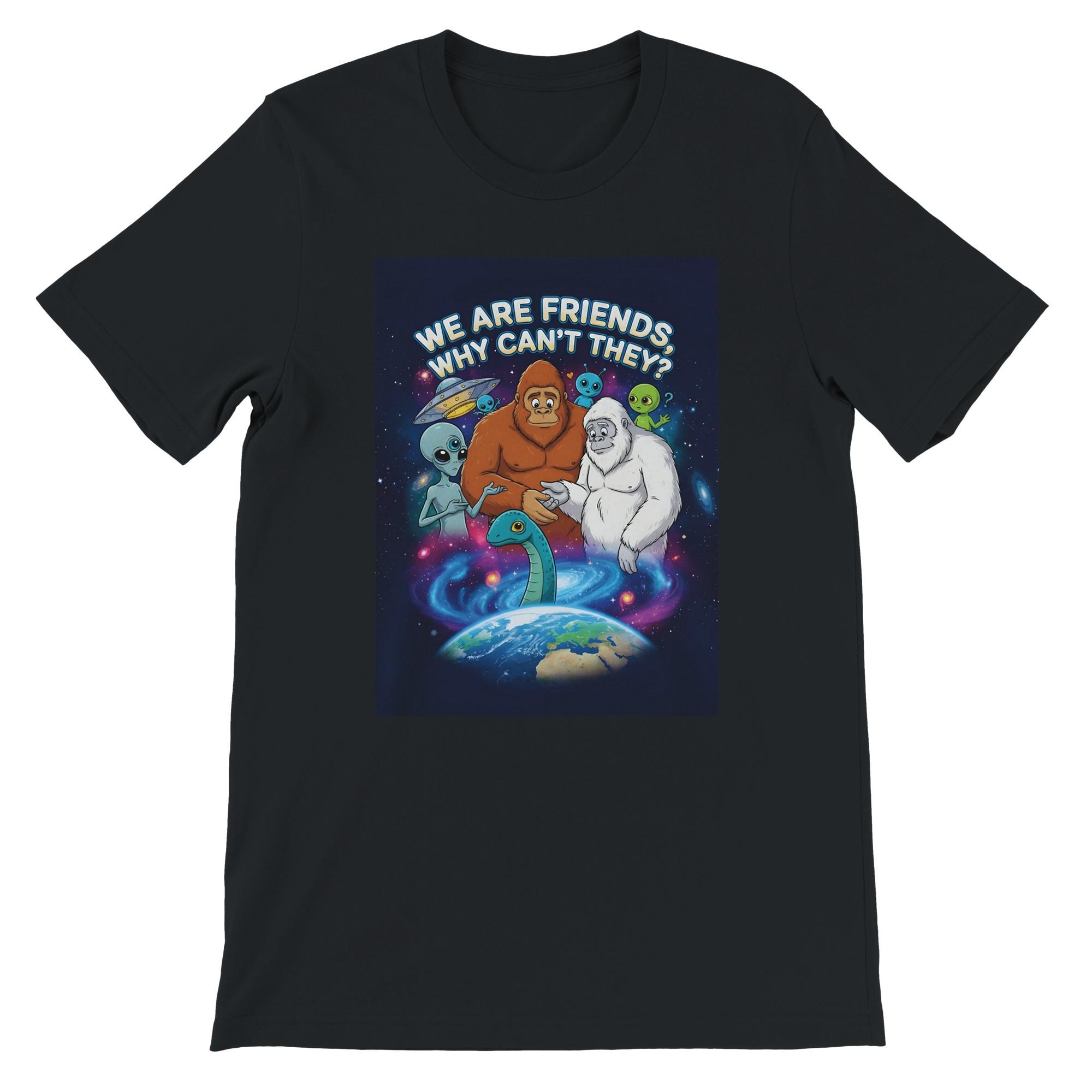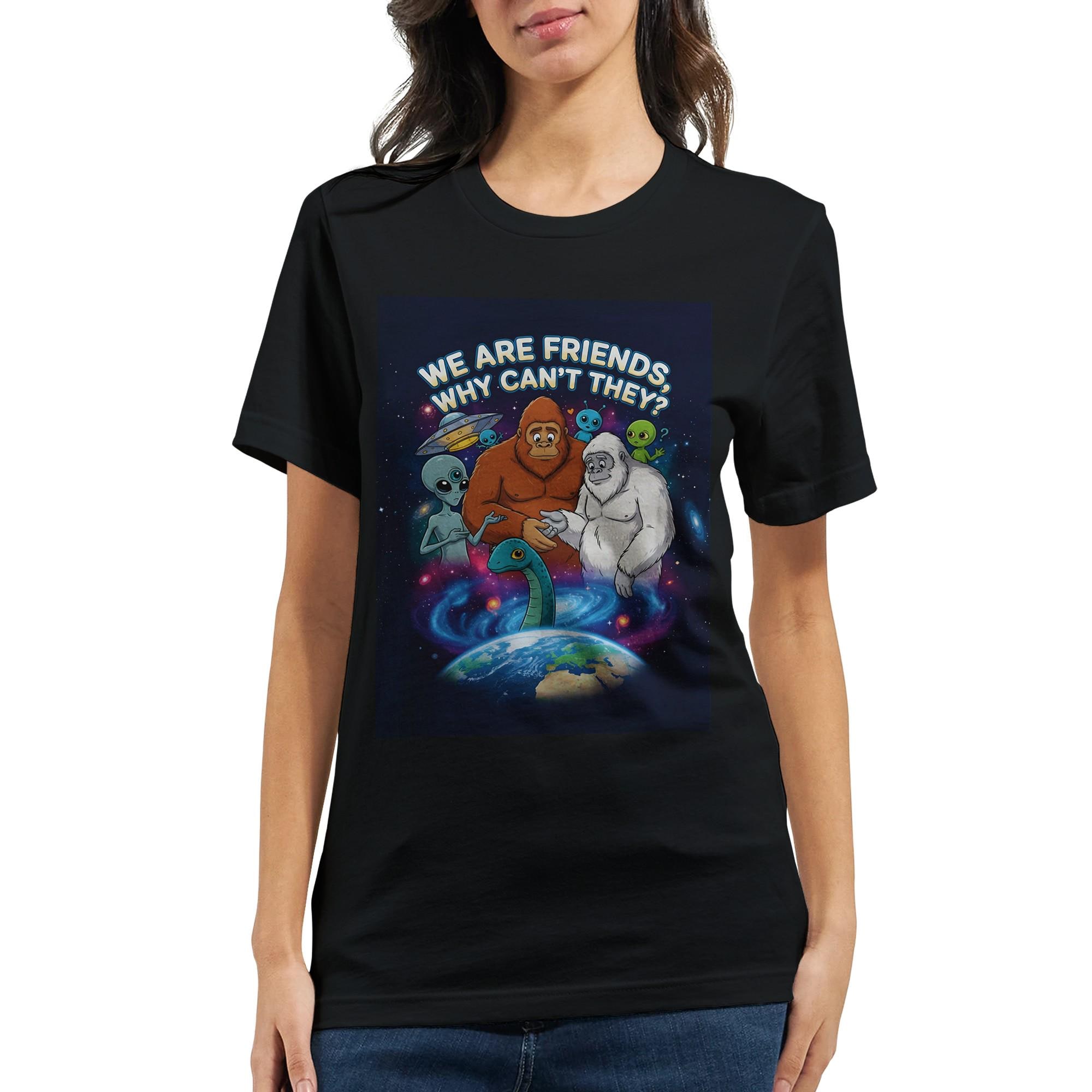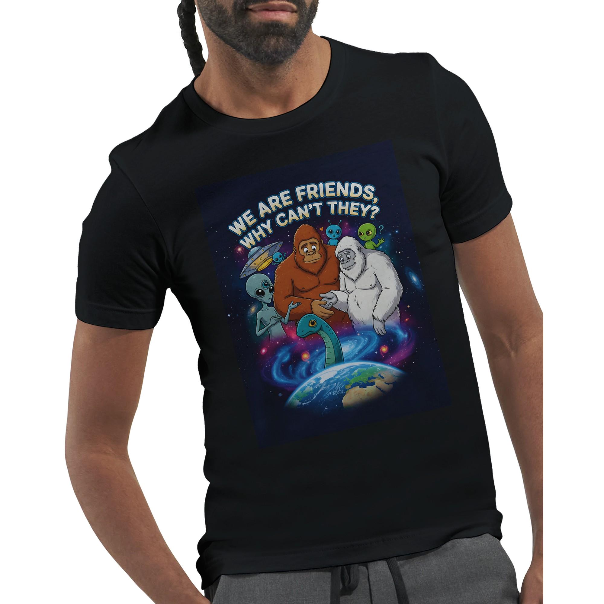 Blast off into a world of whimsy with our delightful Cryptids & Aliens Unite T-Shirt! Featuring a heartwarming group portrait of friendly Bigfoot, a white-furred Yeti, and a classic grey alien, this tee is perfect for enthusiasts of all things mysterious and extraterrestrial. Each curious creature gazes down at our enchanting planet Earth with expressions that radiate warmth and wonder.