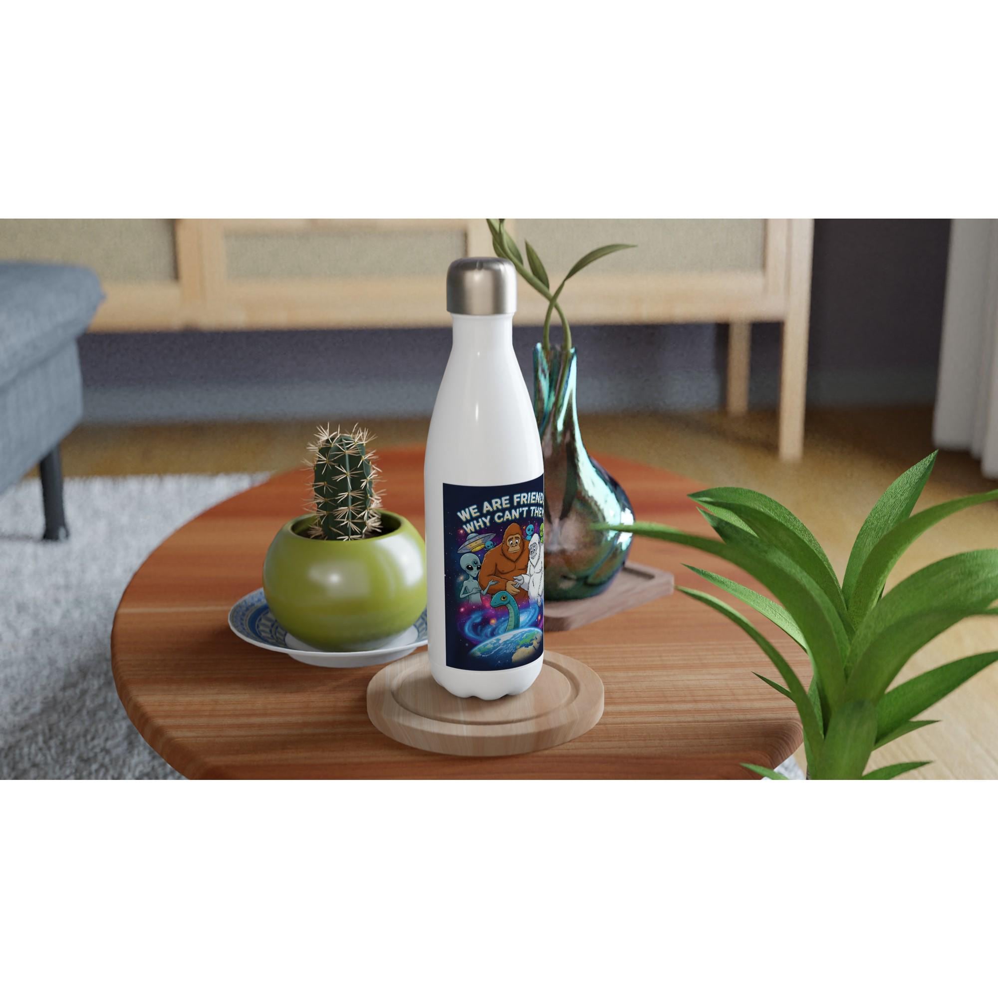 Stay hydrated with our enchanting Cosmic Cryptids Water Bottle, featuring a heartwarming group portrait of beloved cryptids and aliens gathered in space, gazing curiously down at Earth. This bottle showcases a friendly Bigfoot, a fluffy white Yeti, and a classic grey alien – a delightful ensemble that’s bound to spark conversations and bring a smile wherever you go!