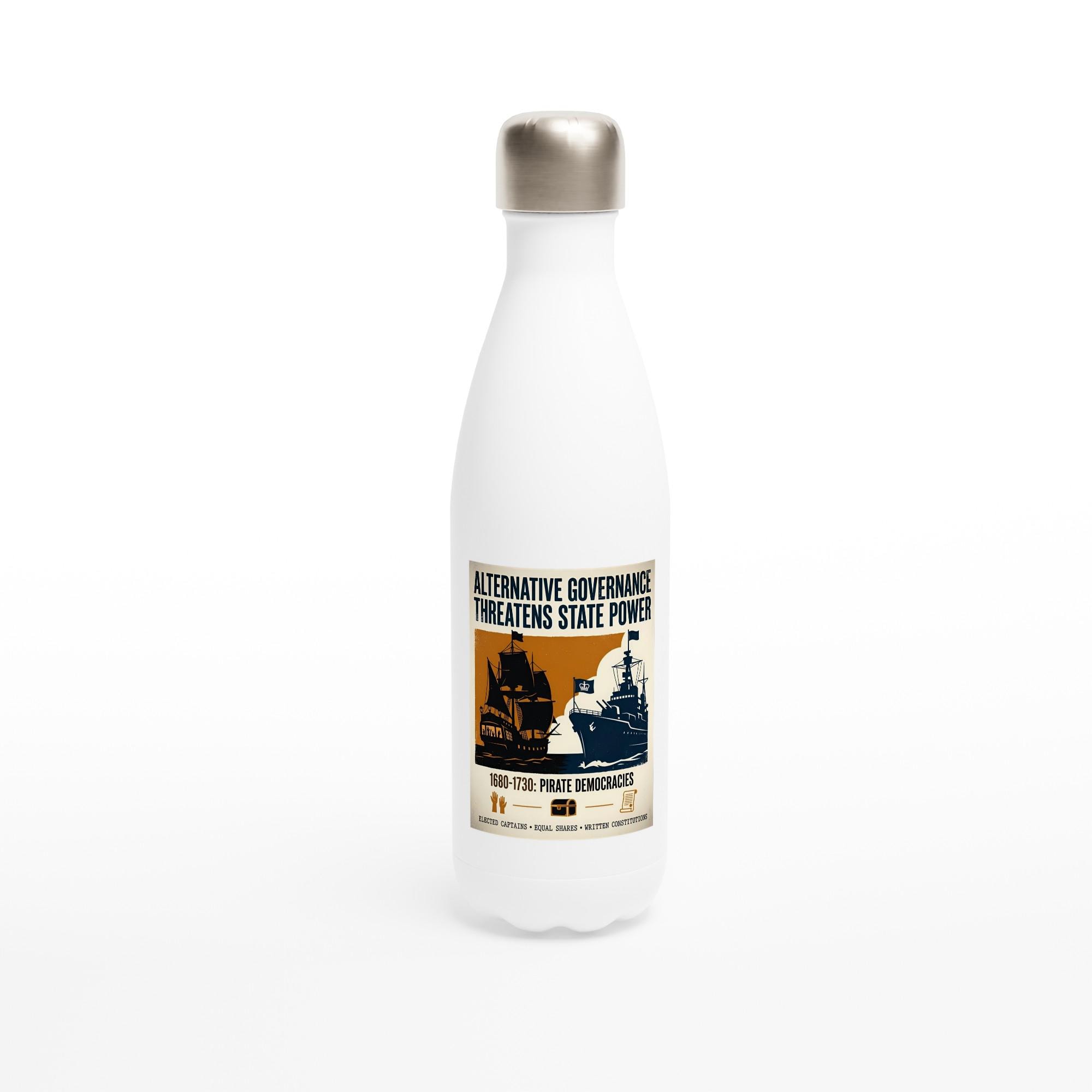 Make a bold statement with this eye-catching 17oz water bottle, featuring a captivating vintage propaganda poster design that sparks conversation! Imagine a dramatic silhouette of a pirate ship, its windows revealing a scene of democratic voting with raised hands, boldly contrasted against a menacing royal navy warship adorned with a crown. The headline screams "ALTERNATIVE GOVERNANCE THREATENS", a powerful visual metaphor for the battle between freedom and oppression.