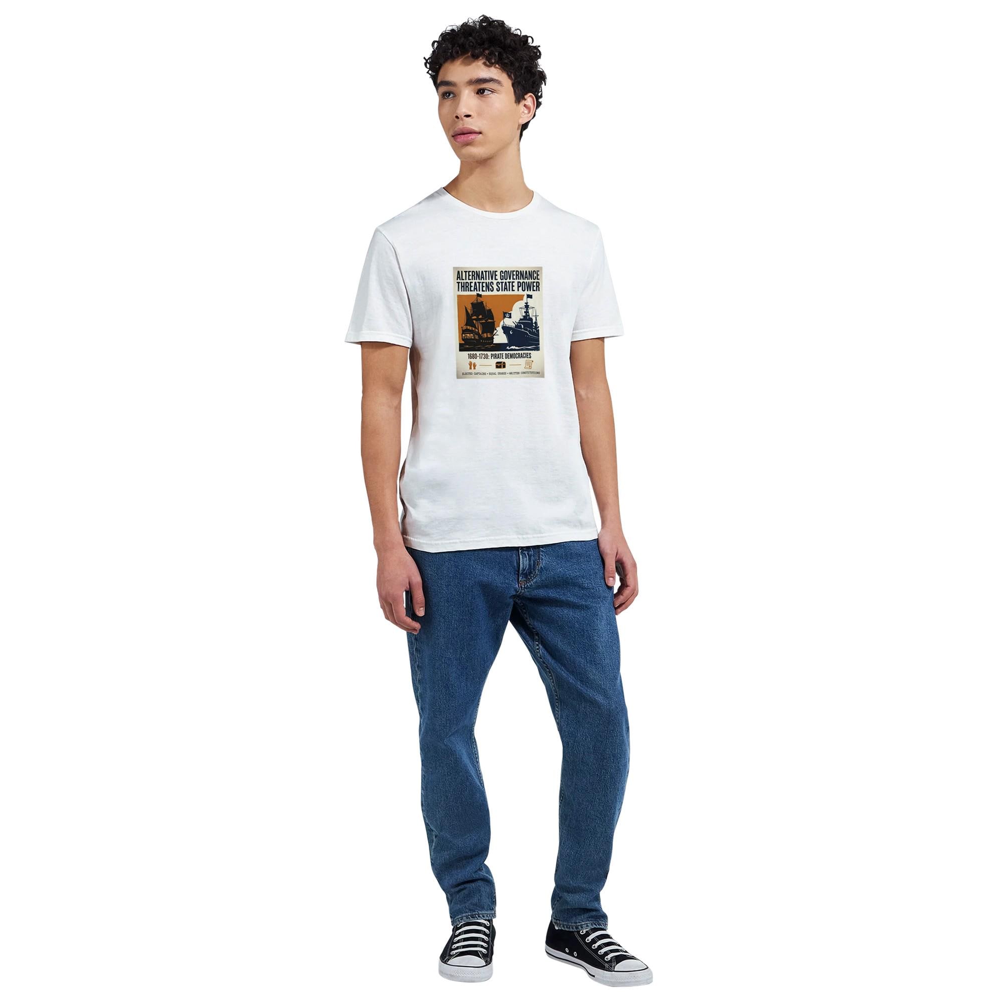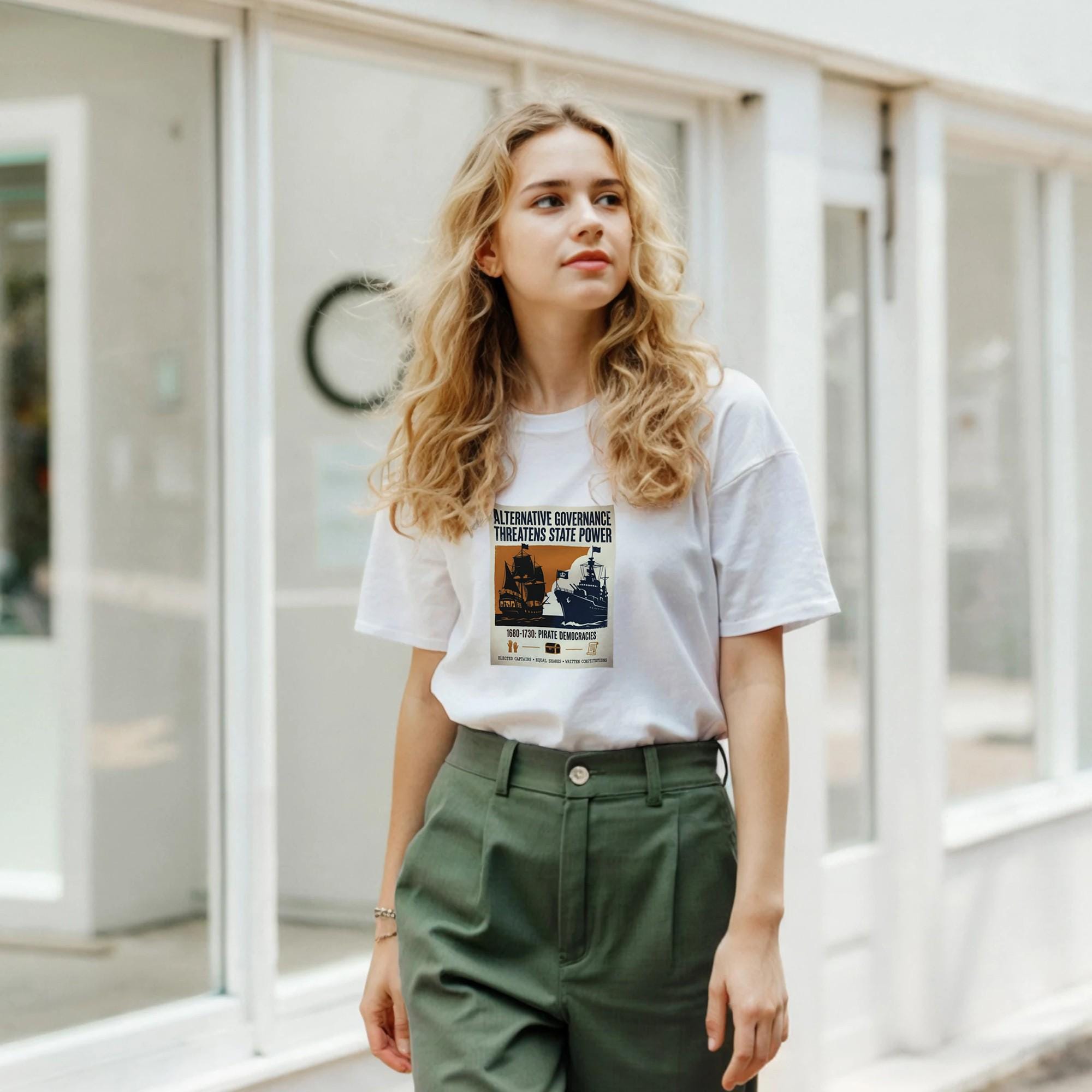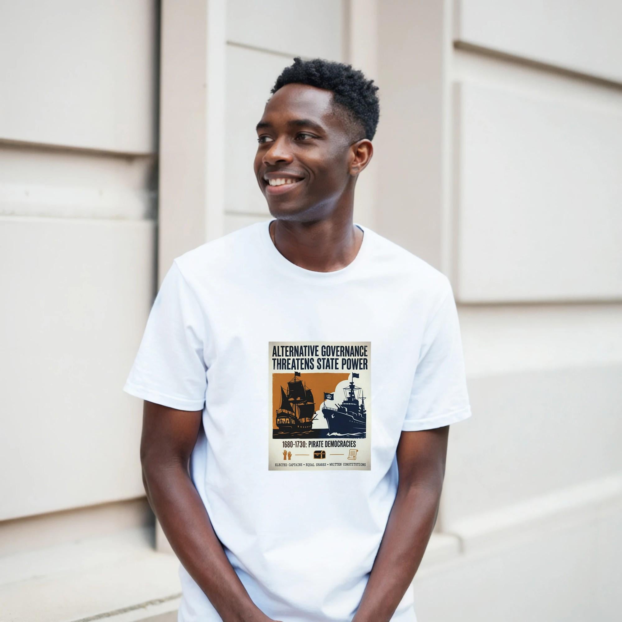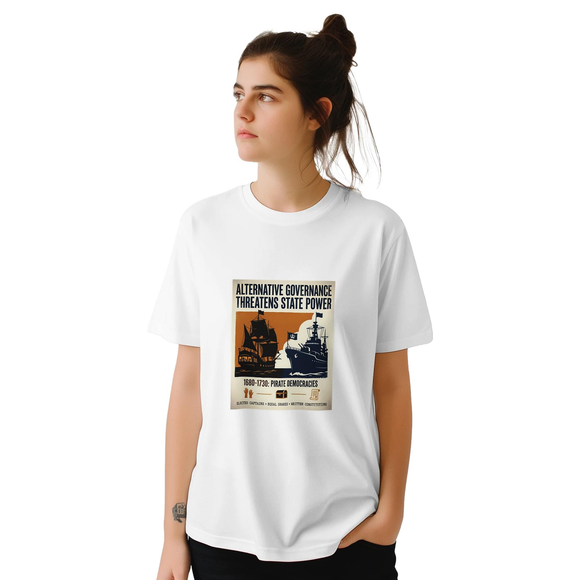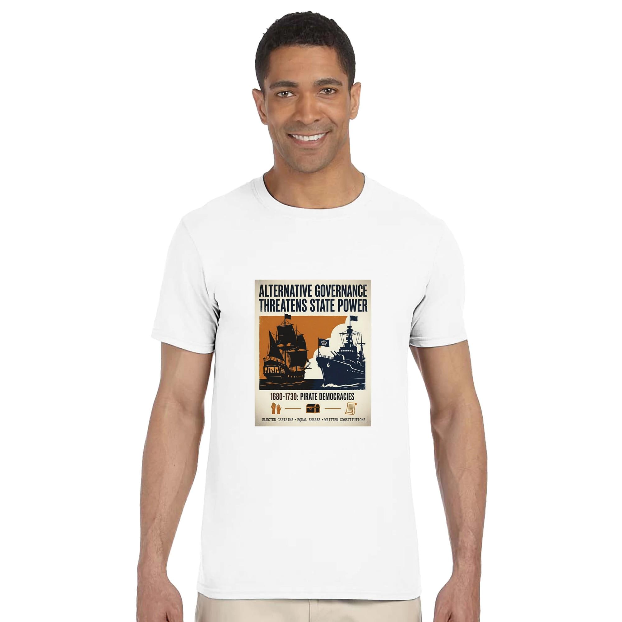 Make a statement with this unique t-shirt, featuring a striking vintage propaganda poster design! The bold typography and contrasting imagery tell a powerful story: a silhouette of a pirate ship, symbolizing alternative governance with democratic voting scenes visible through its windows, stands against a royal navy warship bearing a crown.